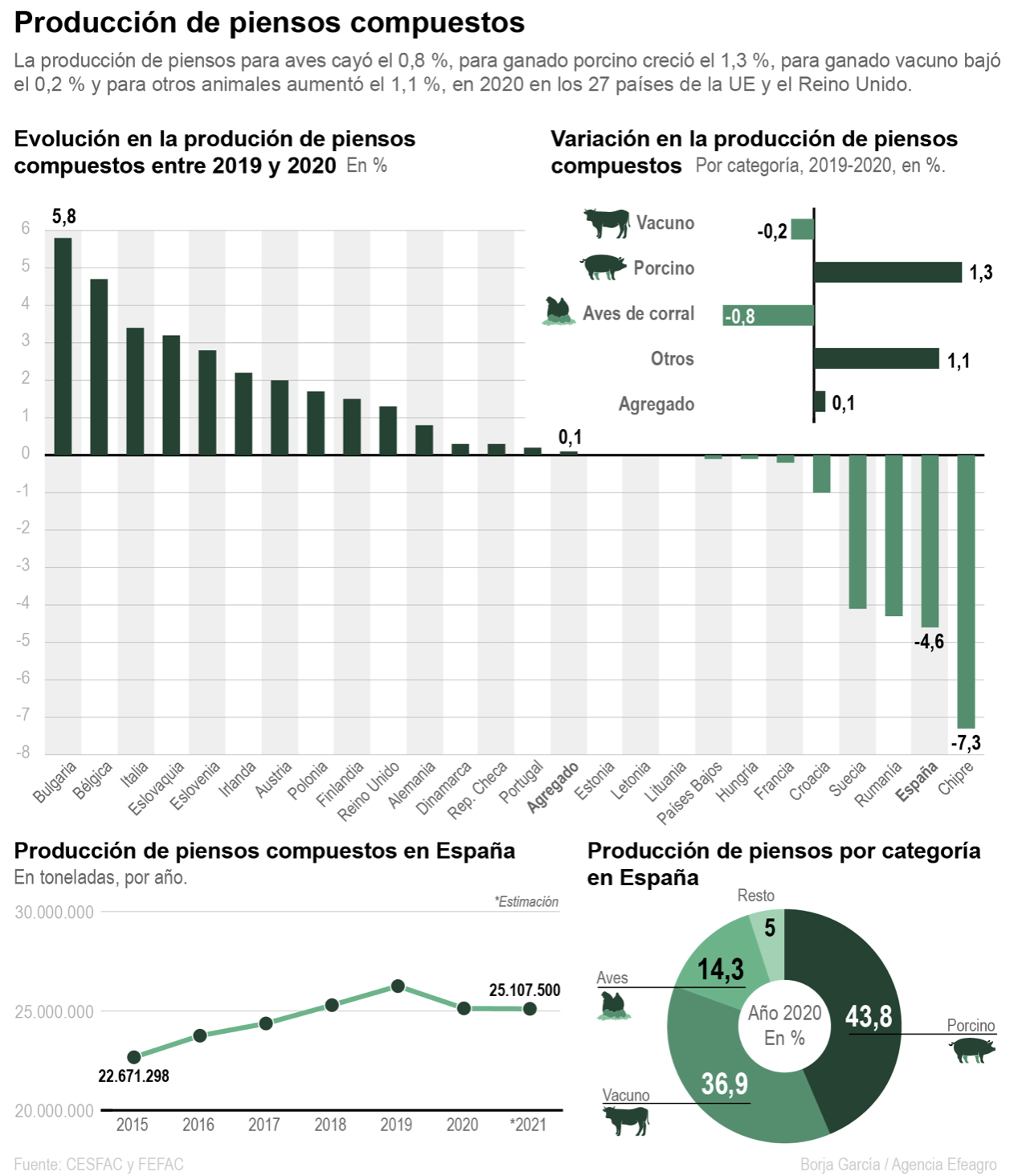 Según datos del Ministerio de Agricultura, Pesca y Alimentación (MAPA) de agosto pasado, el maíz se ha encarecido un 33 % anual; la cebada, un 31 %; el trigo, un 25 %; y la soja, un 21 %, mientras que todas las categorías de pienso han incrementado su precio entre un 10 y un 25 %.